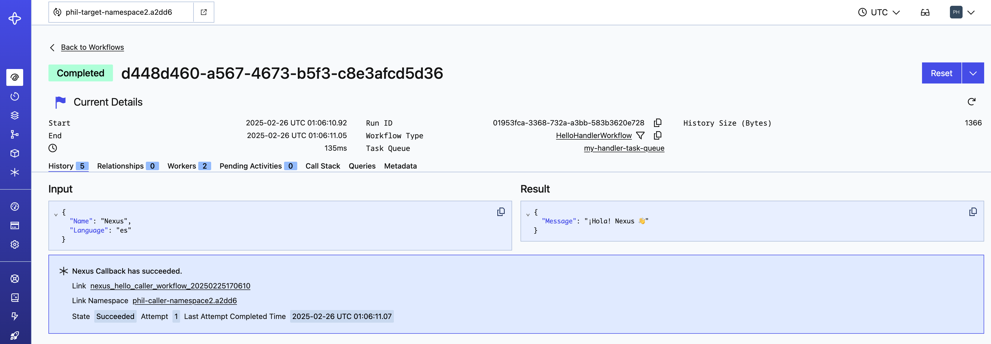 Nexus callbacks are sent from the handler's Namespace to the caller's Namespace to complete an asynchronous Nexus Operation. These show up in the UI and using: temporal workflow describe.